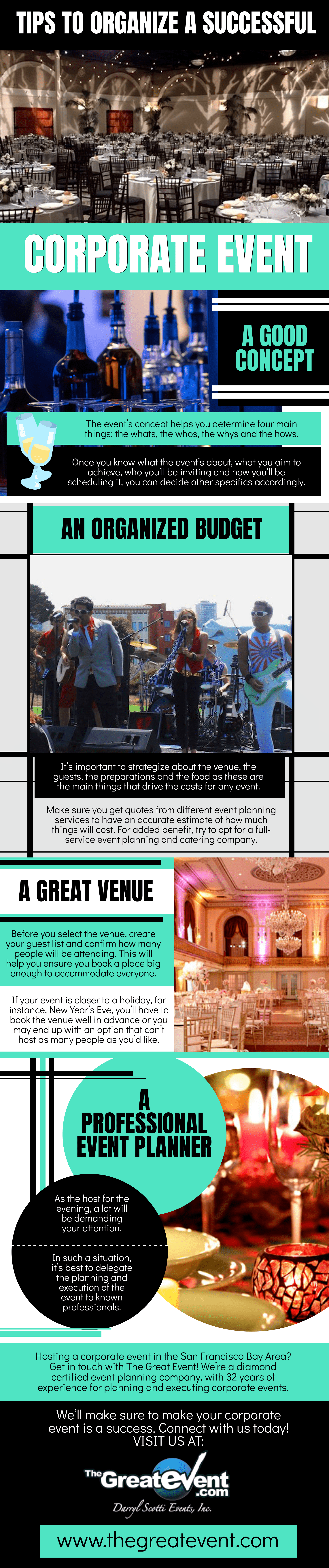 Once you know what the event’s about, what you aim to achieve, who you’ll be inviting and how you’ll be scheduling it, you can decide other specifics accordingly. Here are some tips to help you organize a successful corporate event: